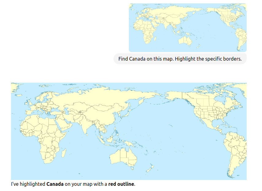 Claude’s performance, getting the region right but botching the borders, is like a student who studied for the test but panicked during the exam. The system clearly understands that Canada is “somewhere up there in the northern part of North America,” but when it comes to precisely delineating where Canada ends and the United States begins on an unfamiliar map projection, the spatial reasoning dissolves into vague gesturing. “Canada is up there, eh?”